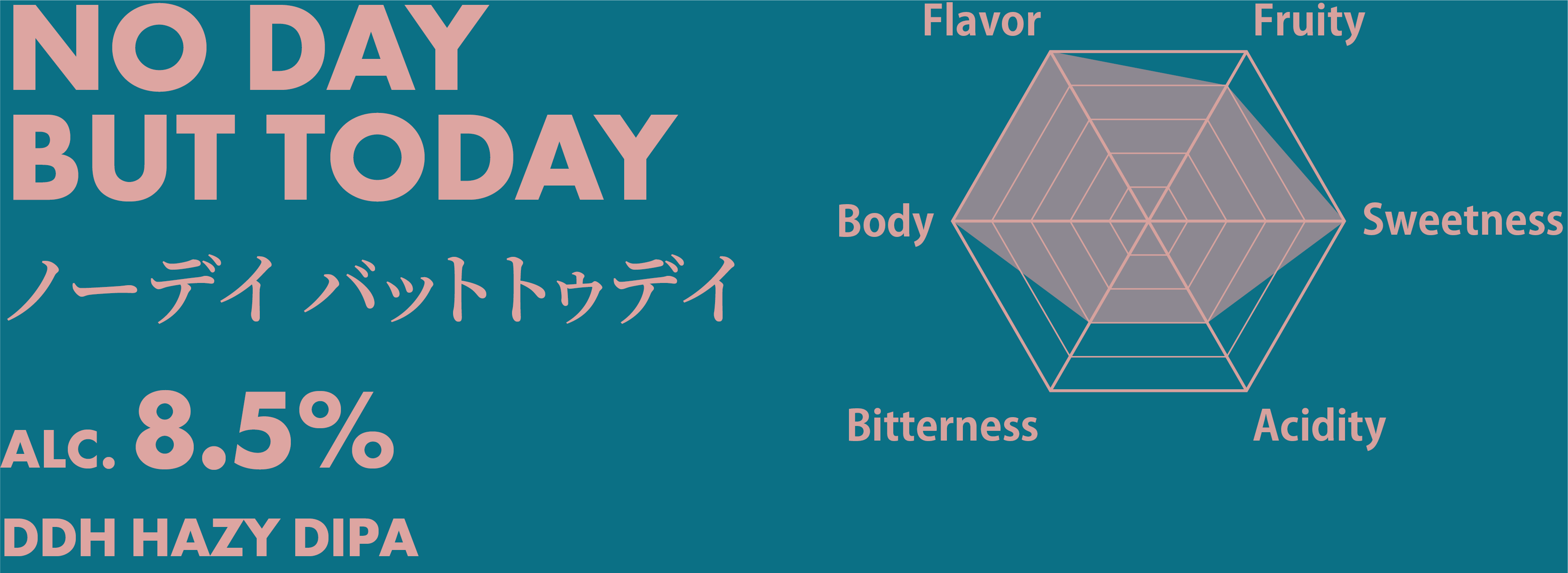 ブルワーの探求心は続き、新酵母で醸すDDHヘイジーシリーズの第5弾。前回シリーズからさらに大幅にホップ量を増やし、もぎたてのパッションフルーツやマンゴーを丸かじりしてる様な弾けるホップのフレッシュさは「この瞬間(NOW)じゃないと」味わえないジューシーさをダイレクトに感じさせてくれる脳汁ドバドバHAZY IPA。