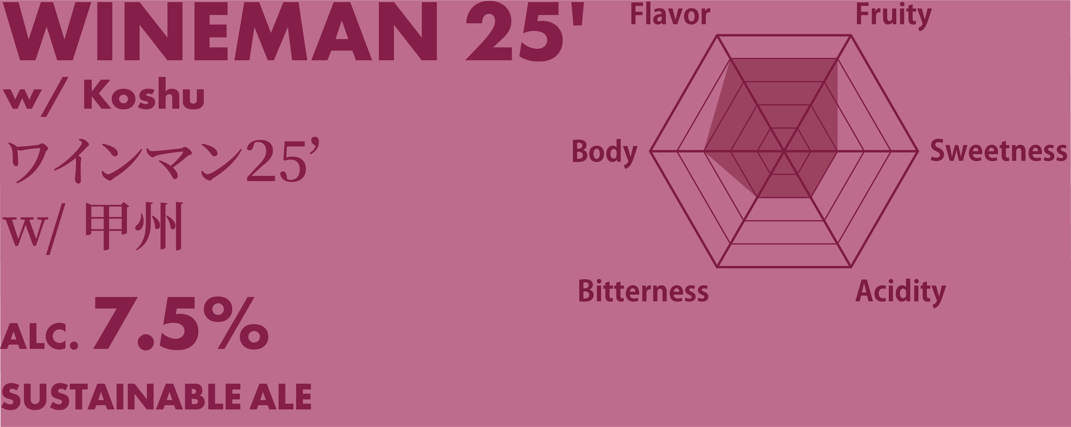 毎年恒例のワインマンとのコラボレーションビール。第二弾は甲州ぶどうの搾りかすを使用。通常のエール酵母に加え、シャンパン酵母を併用して醸したラグジュアリーな風味。程よいホップの苦みと甲州ぶどうの皮のダイレクトな香りを楽しめるサスティナブル・エール。