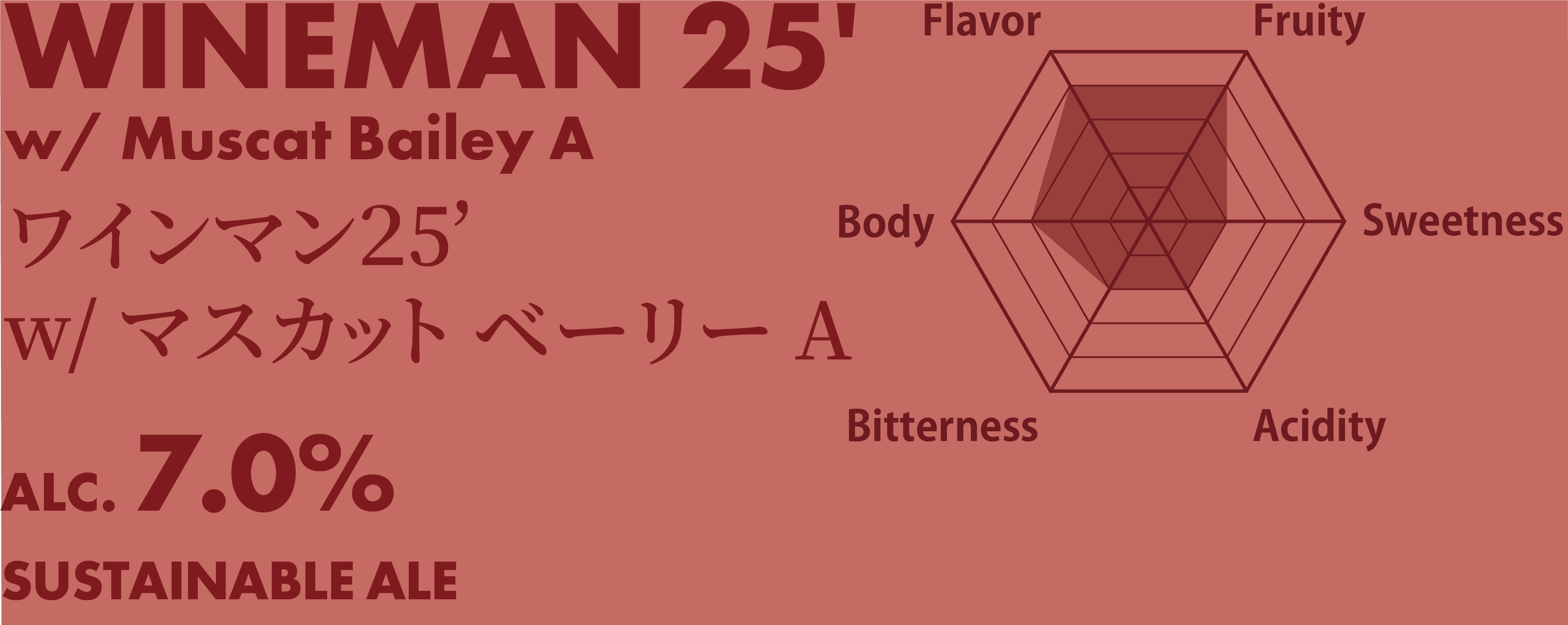 毎年恒例のワインマンとのコラボレーションビール。第一弾はマスカットベーリーAの搾りかすを使用。ホップの量は最小限にし、葡萄の皮に残るほのかな香りを抽出。フルーティーなアロマとしっかりとしたボディー感を楽しめるサスティナブル・エール。