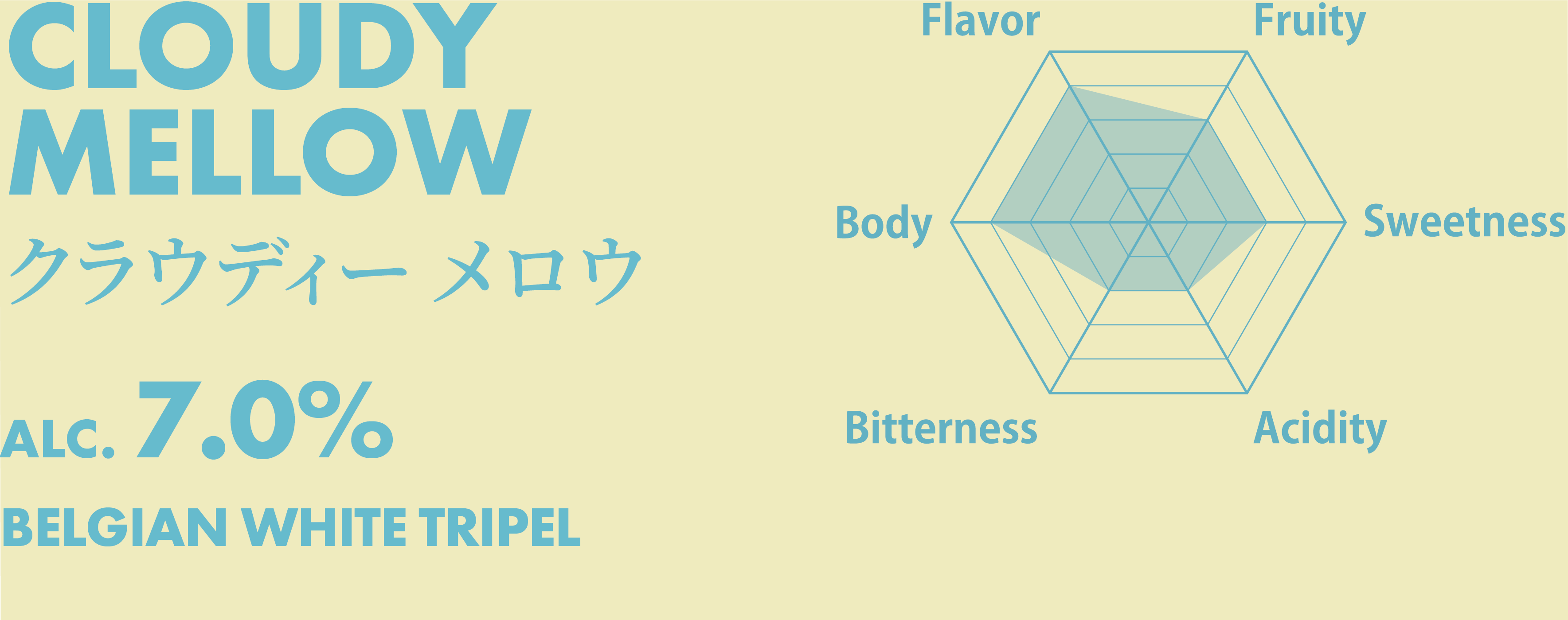 大空に漂う雲のような滑らかなマウスフィールと共に広がるのは、オレンジピールの華やかな甘みとみずみずしい香り、コリアンダーのスパイス由来の清涼感。小麦の余韻が優しく包み込み、心が軽くなる芳醇なBELGIAN WHITE TRIPEL。